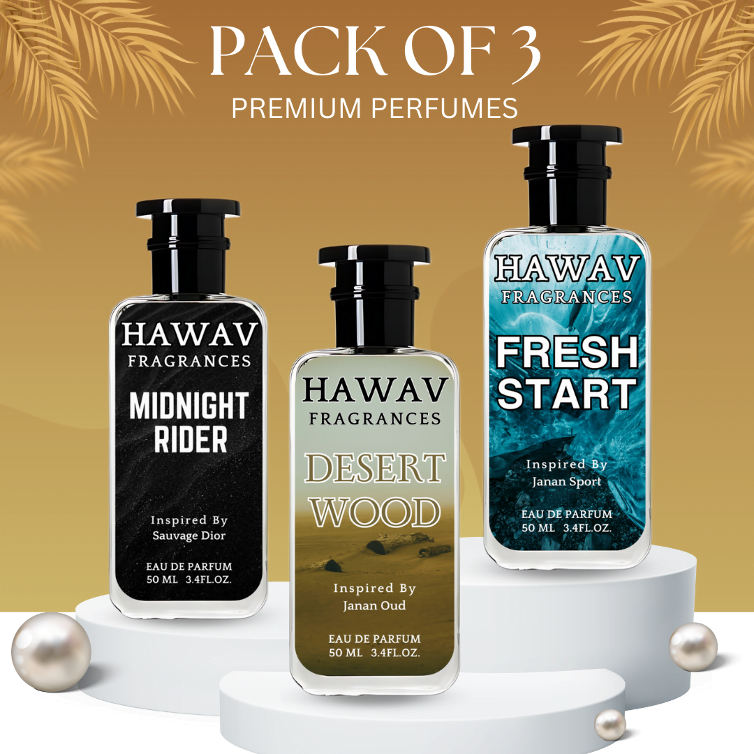 Indulge in the ultimate fragrance experience with this exclusive pack of three captivating scents: Midnight Rider, Desert Wood, and Fresh Start. Each fragrance is meticulously crafted to evoke the essence of iconic perfumes while offering a unique and unforgettable olfactory journey.