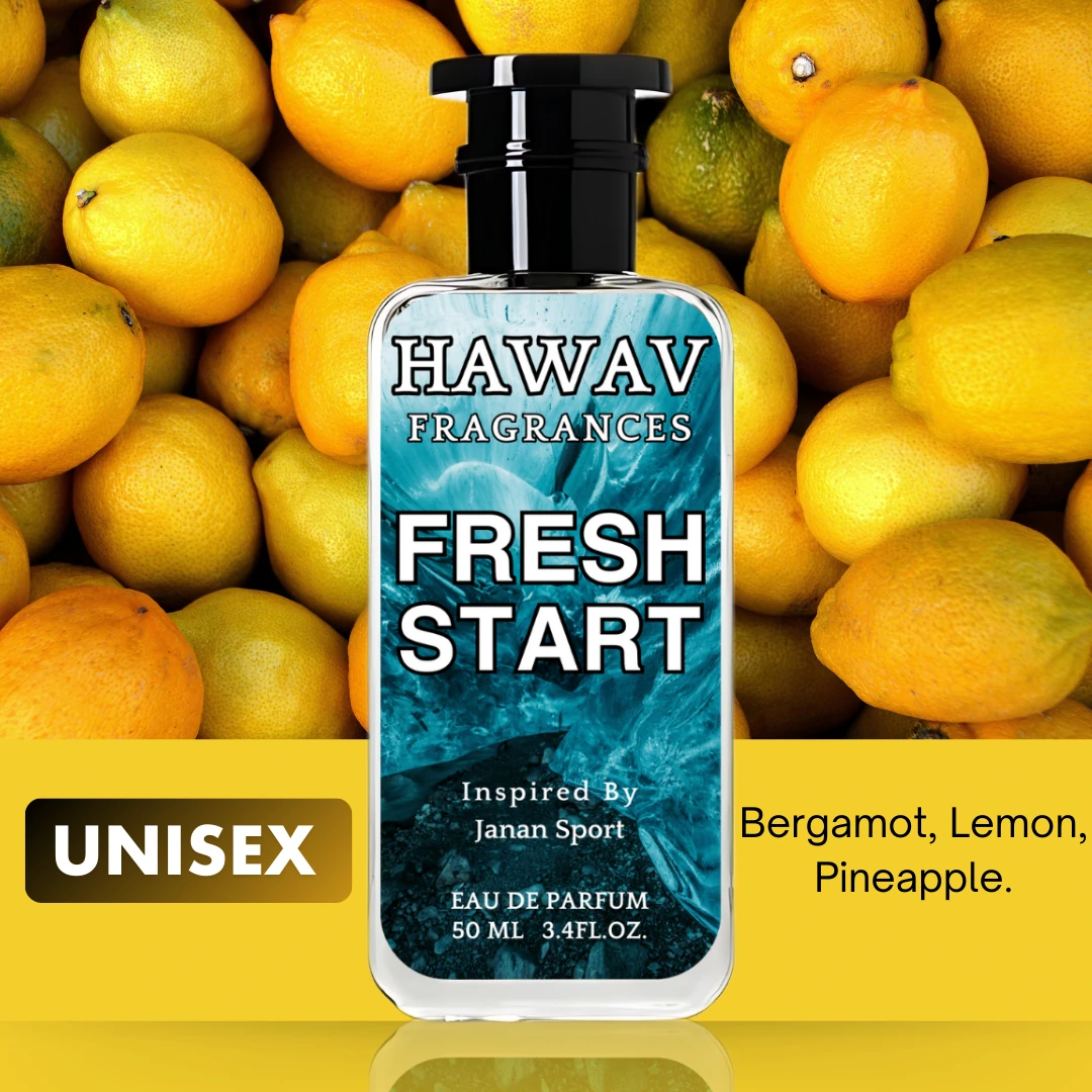 Fresh Start: Refresh and revitalize with Fresh Start. Inspired by Janan Sport, this fragrance offers a burst of energy and vitality. Its citrus top notes, followed by a floral heart and a clean, musky base, make it the perfect choice for the active and energetic man.