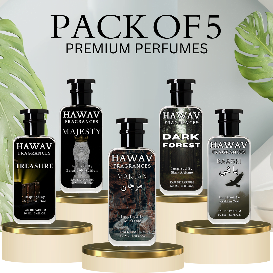 PACK OF 5 TREASURE, MAJESTY, MARJAN, DARK FOREST & BAAGHI 50 ML